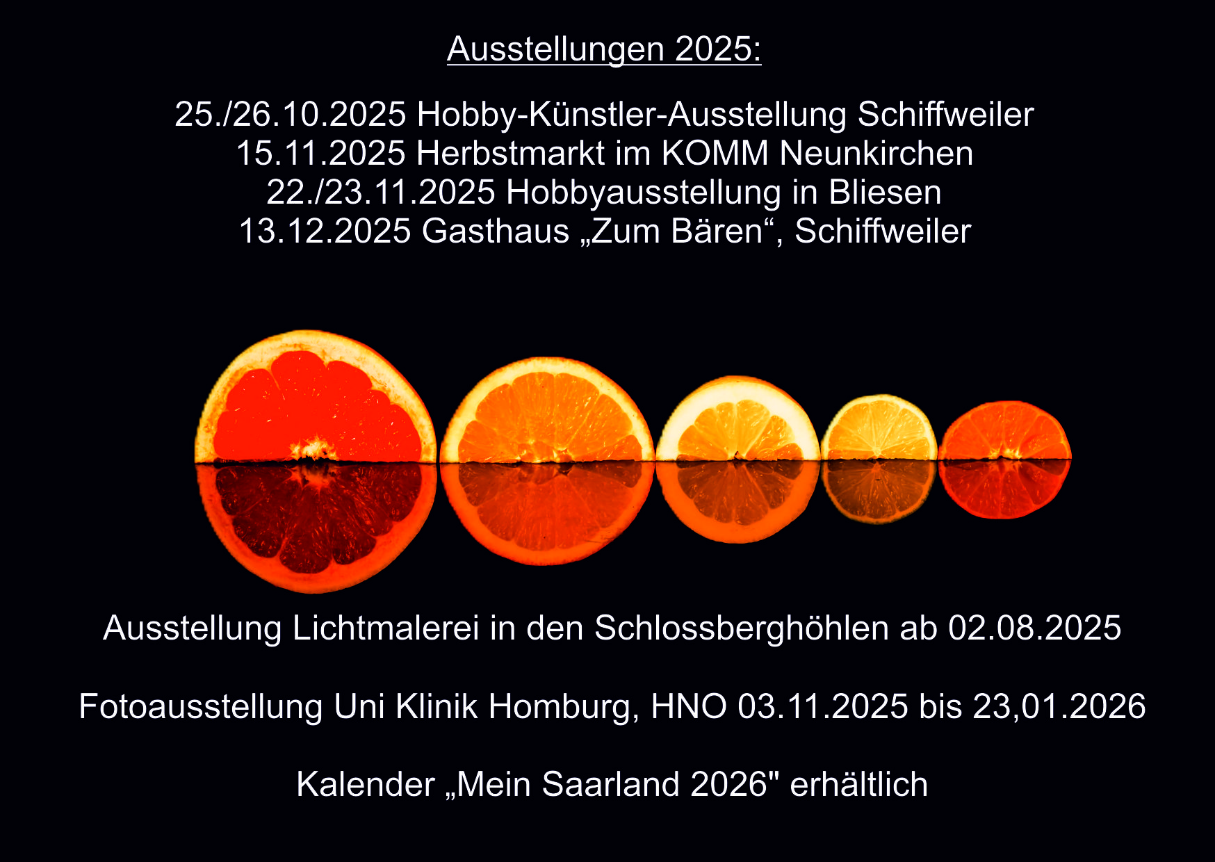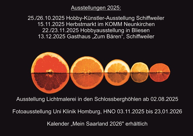 Meine Bilder Kalender etc. können Sie bei den folgenden Veranstaltungen sehen. Ich freue mich auf Ihren Besuch!